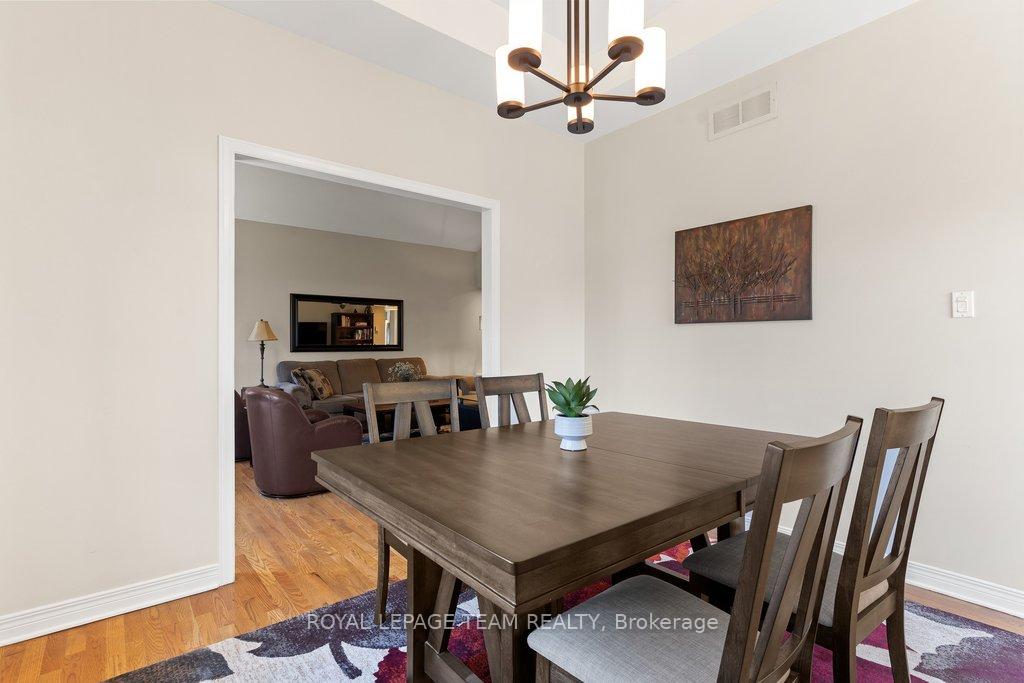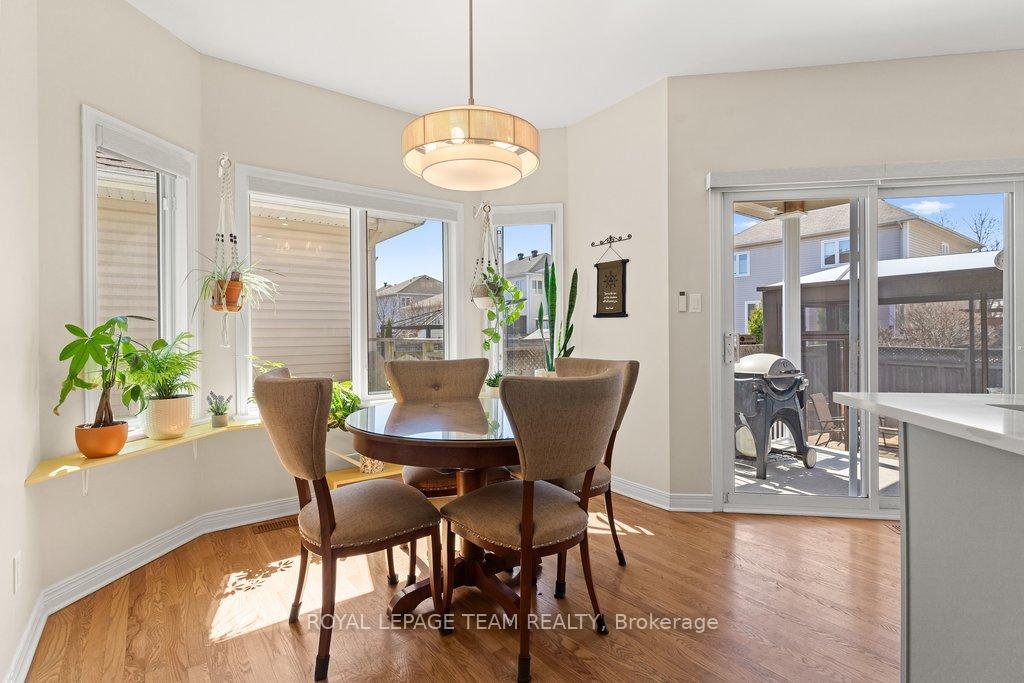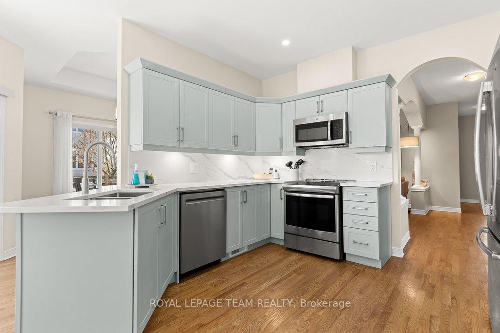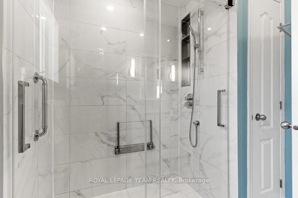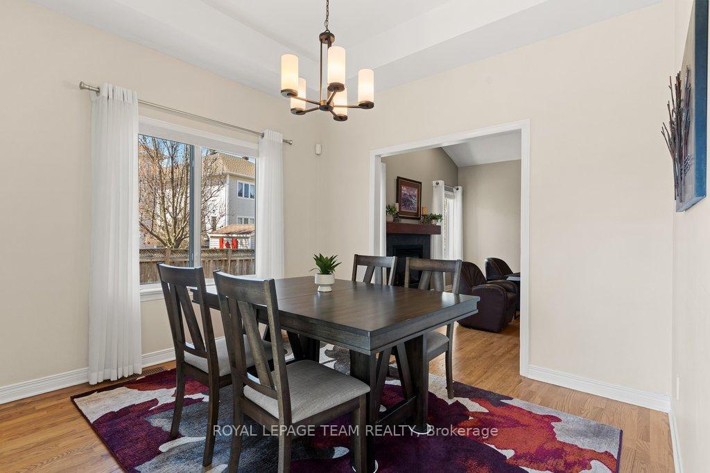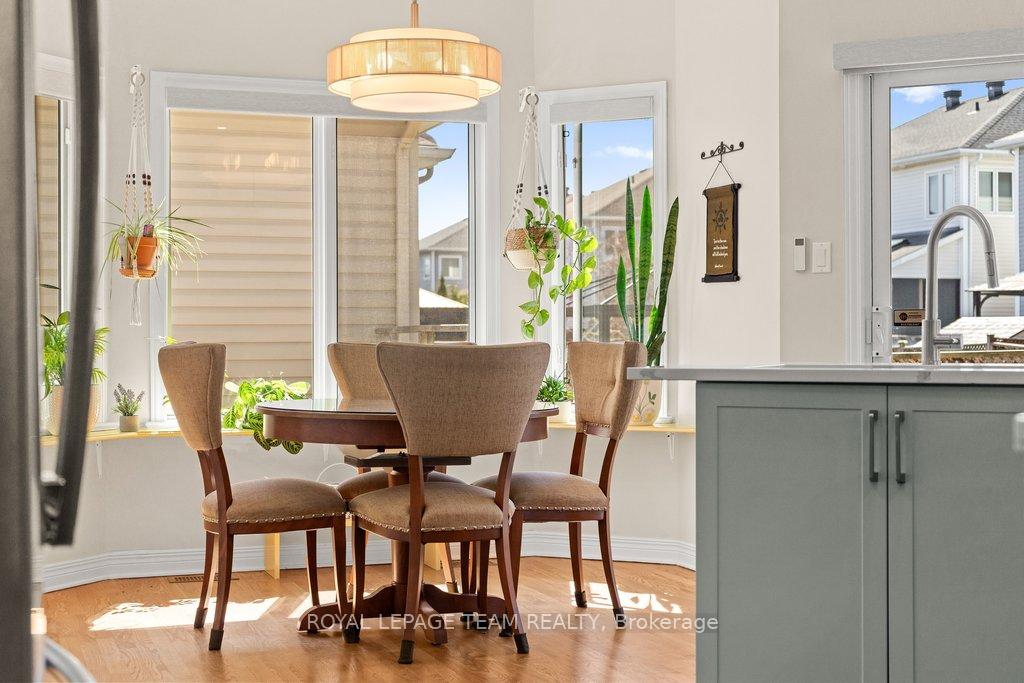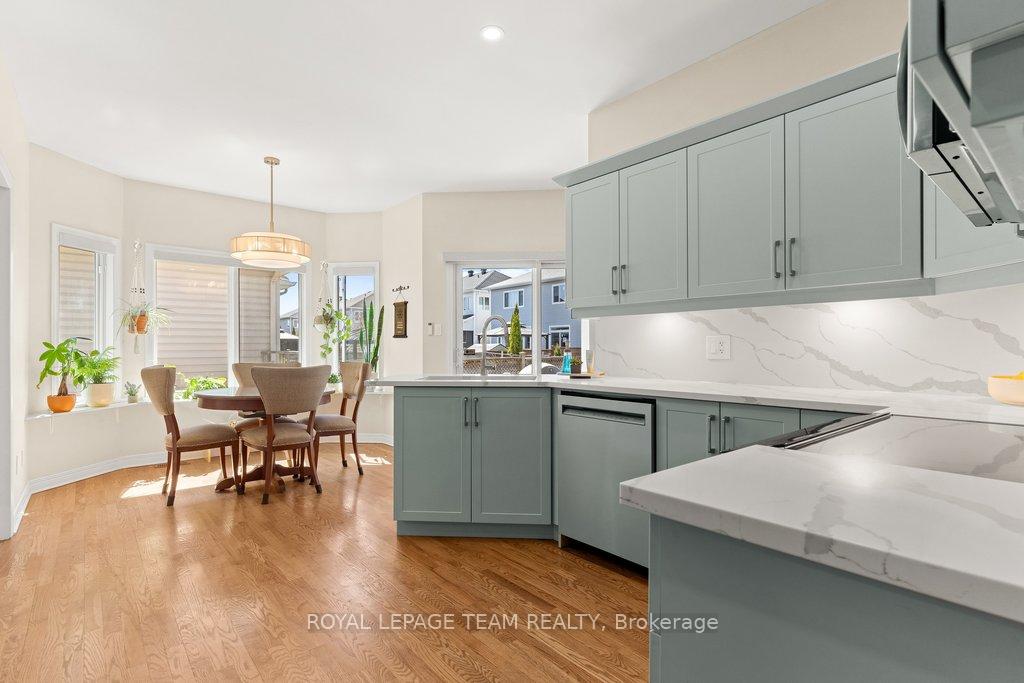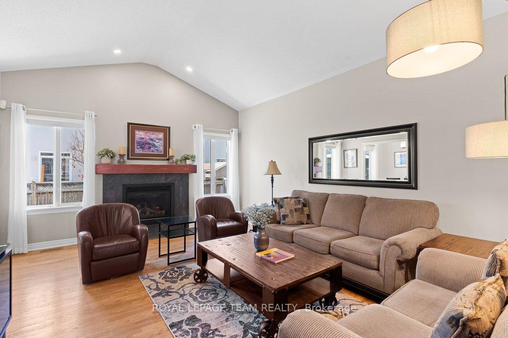 Welcome to this impeccably maintained 3-bedroom single-family home in the heart of Stittsville. This bright, sun-filled bungalow features high-end, modern finishes throughout. The main level offers hardwood and tile flooring, a formal dining room, and a spacious living area with a gas fireplace. The fully renovated kitchen (2023) includes an eat-in area ideal for everyday living. The primary suite features a walk-in closet and a renovated ensuite (2023) with heated floors and curbless shower. Two additional well-sized bedrooms and an updated main bath (2025), also with heated floors, complete the main level. The fully fenced backyard is set up for outdoor enjoyment with a new gazebo (2025) ,planter beds and irrigation system. The spacious finished basement adds valuable living space with a large rec room, bedroom, full bath, massage room, and workshop. Professionally painted with custom window coverings throughout. Conveniently located within walking distance to schools, parks, restaurants, transit, and the Trans Canada Trail.