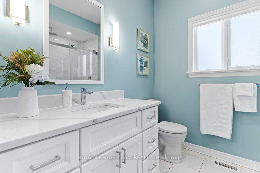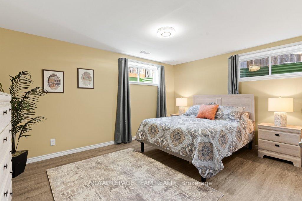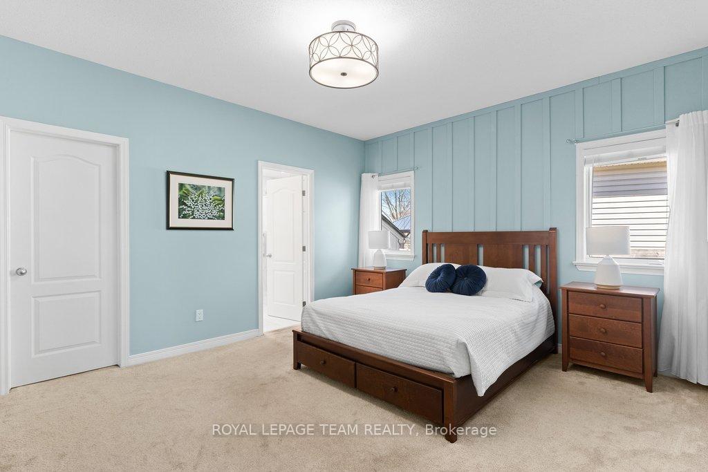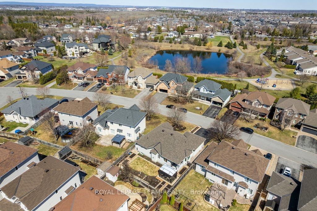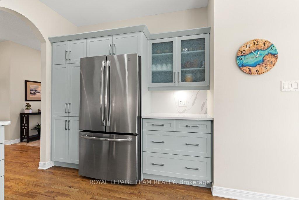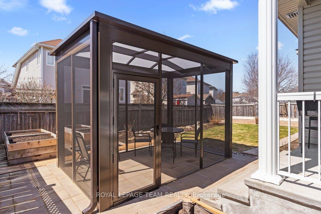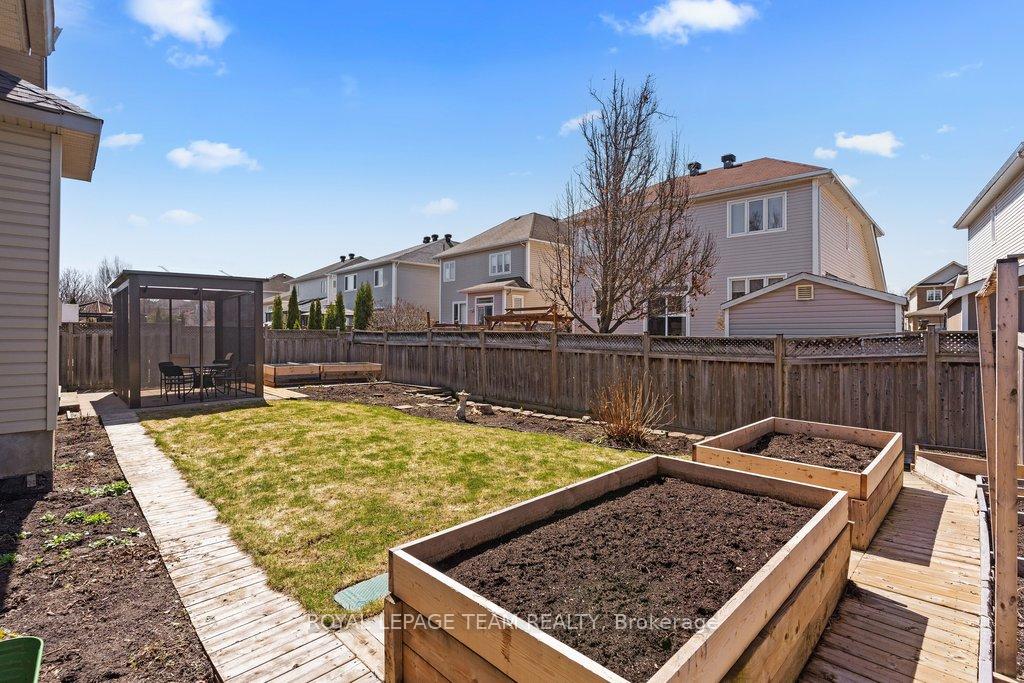 Welcome to this impeccably maintained 3-bedroom single-family home in the heart of Stittsville. This bright, sun-filled bungalow features high-end, modern finishes throughout. The main level offers hardwood and tile flooring, a formal dining room, and a spacious living area with a gas fireplace. The fully renovated kitchen (2023) includes an eat-in area ideal for everyday living. The primary suite features a walk-in closet and a renovated ensuite (2023) with heated floors and curbless shower. Two additional well-sized bedrooms and an updated main bath (2025), also with heated floors, complete the main level. The fully fenced backyard is set up for outdoor enjoyment with a new gazebo (2025) ,planter beds and irrigation system. The spacious finished basement adds valuable living space with a large rec room, bedroom, full bath, massage room, and workshop. Professionally painted with custom window coverings throughout. Conveniently located within walking distance to schools, parks, restaurants, transit, and the Trans Canada Trail.